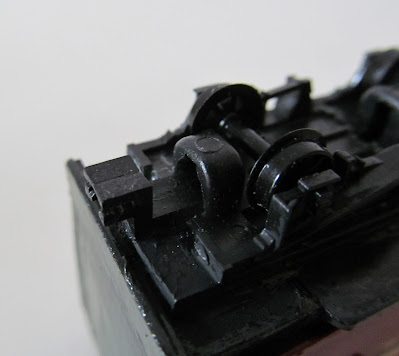 Next, I added Peco NEM coupling pockets to the coaches, these can sit directly in front of the N gauge coupling mouldings, you will need to open the mouldings out to allow the new pockets to be fitted in the correct positions on the chassis, also a small amount of the pocket mould will need to be trimmed back. The good thing with these is that they sit at more or less the right level to work with other 009 couplings.